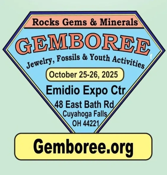 25-26—CUYAHOGA FALLS, OHIO: Show and sale; Akron Mineral Society & Summit Lapidary Club; Emidio & Sons Expo Center, 48 East Bath Road; Sat. 10-6, Sun. 10-5; Admission: Adults $6, seniors (55+) & Students $5, Children (7-14) $1, scouts in uniform free; 38 quality vendors. Gemboree!! Demonstrations, silent auction & children’s activities. Mineral id throughout the day. Wheelchair accessible, food trucks both days and credit cards acceptable for admissions; Contact: Evelyn Tryon, (330) 673-9664; Email: Gemboree76@gmail.com (vendor chair); Website: summitlapidaryclub.com/gemboree or Cathy @ slcmembershipchair@gmail.com (Show chairman);