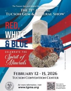 12-15—TUCSON, ARIZONA: Annual show; Tucson Gem & Mineral Society; Tucson Convention Center, 260 S. Church Avenue; Thurs-Sat 10am-5pm, Sun 10am-4pm; Admission – $15, Children 14 and under FREE with paying adult; Fri 2/13 is $2 OFF for Military (active & retired) and Senior Citizens (62+); $2 OFF coupon can be found on the website; This year: Red, White & Blue – Celebrate the Spirit of Minerals!